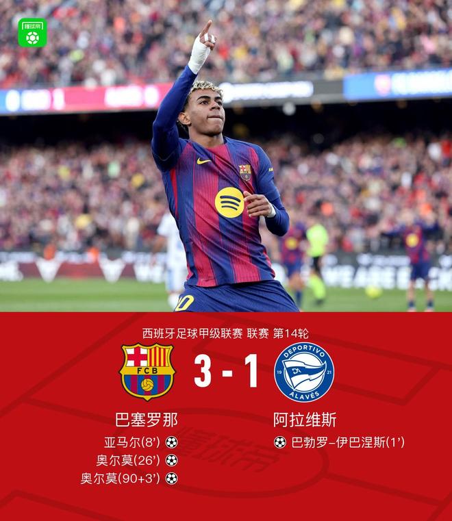 北京时间11月29日,西班牙足球甲级联赛第14轮,巴塞罗那主场迎战阿拉维斯。开场第一分钟,伊巴涅斯门前射门,随后亚马尔推射扳平比分。随后拉菲尼亚助攻奥尔莫进球。下半场补时阶段,亚马尔助攻,奥尔莫进球,球队拿到两分。最终,巴塞罗那3-1击败阿拉维斯。关键时刻:巴萨开场第一分钟就丢球!伊巴涅斯门前破门,巴塞罗那0-1战胜阿拉维斯。第7分钟,奥尔莫传球被莱万多夫斯基挡出。亚马尔紧随其后,将比分追平。巴塞罗那1-1阿拉维斯。第26分钟,拉菲尼亚助攻奥尔莫进球。巴塞罗那2-1击败阿拉维斯。第66分钟,巴萨门将教练德拉富恩特吃到红牌。摄像机没有解释这90+3分钟内发生的事情。亚马尔助攻奥尔莫进球,带领巴萨3-1战胜阿拉维斯。来自双方的球员埃姆斯在一个激动人心的时刻加入了游戏。比赛立即开始。第24分钟,胡安·加西亚勇敢扑出霍尼·奥托的关键进球。第27分钟,巴萨前锋将比分改写为3-2。最终我们没能传好球。第29分钟,亚马尔禁区内倒地。裁判没有给出任何指示。埃里克·加西亚在第 33 分钟被放倒。第39分钟,阿拉维斯防守失误,拉菲尼亚无法攻破西维拉。第44分钟,他们错失良机。亚马尔接过球,将球踢入门框,让球门几乎空了。第46分钟,中场球员被换下,拉什福德和孔德替补登场,埃里克·加西亚和贝尔纳尔替补上场。第50分钟,拉菲尼亚远射,但皮球被西维拉没收。第60分钟,莱万多夫斯基和拉菲尼亚倒地,佩德里和费兰插上。第62分钟,拉什福德禁区外接球。裁判没有判罚指示。第71分钟,孔德倒三角逆转,奥尔莫射门偏出。第85分钟,格里迪的射门被胡安·加西亚挡出,裁判示意越位。 9分钟0+2,奥尔莫禁区边缘倒地。裁判没有出示球队阵容的技术统计数据。