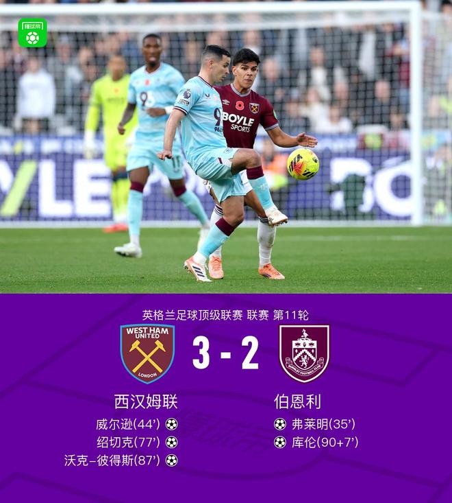 北京时间11月8日23:00,英超第11轮比赛,西汉姆联队主场迎战伯恩利。比赛中,弗莱明率先进球打破僵局,威尔逊有机会扳平比分。西汉姆联队在换边后继续施压,苏切克和沃克-彼得斯利用对方门将的失误锁定了二连胜。最后时刻,凯伦在补时阶段攻入一球。全场比赛结束,西汉姆联队以3-2击败伯恩利队。重要赛事第35分钟,弗莱明头球破门。首回合比赛,伯恩利1-0获胜。第44分钟,威尔逊门前头球扳平比分。西汉姆联1-1伯恩利。第77分钟,绍切克从后面击中门柱。第87分钟,西汉姆联2-1战胜伯恩利。沃克·彼得斯主罚一脚终结比赛。西汉姆联3-1伯恩利。阿雷奥拉在第90分钟和第6分钟也有射门尤特斯。伯恩利扳回一球。两队球员以3-2的比分进入比赛。第15分钟,比赛即将开始。这是一个很好的机会。第35分钟,弗莱明未能接球。第69分钟弗莱明头球破门,伯恩利客场1-0领先。第44分钟,威尔逊门前头球扳平比分。西汉姆联1-1伯恩利。第69分钟,拉尔森传球。雨果·舒克的头球攻门过高,被门将没收。第77分钟,绍切克击中立柱破门。第87分钟,西汉姆联2-1战胜伯恩利。沃克·彼得斯补射终结比赛。西汉姆联3-1伯恩利。阿雷奥拉在第90分钟和第6分钟也有射门。伯恩利进球,3-2。咪咕独家查看英超球队阵容技术统计【咪咕独家看英超】