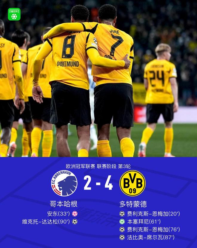 北京时间10月22日,欧冠阶段第三轮哥本哈根对阵多特蒙德。维克托·达德森在哥本哈根进球。多特蒙德方面,费利克斯·恩梅加打进两球,法比奥·席尔瓦进球,本塞拜尼进球,安东打进乌龙球。最终哥本哈根2-4多特蒙德。决战第20分钟,菲利克斯·恩梅加门顶射门取得领先。第33分钟,多特蒙德1-0平。安东在门前不小心打进乌龙球。第61分钟,哥本哈根将比分改写为1-1。拉格禁区内对吉拉西犯规,本塞拜尼破门。多特蒙德 2-1。他在第76分钟梅开二度。菲利克斯·恩梅加倒地得分。法比奥·西在第87分钟为比赛增添了一些火花,多特蒙德以3-1获胜。席尔瓦以小角度打进了他作为球队成员的第一个进球。第90分钟和第2分钟,多特蒙德将比分改写为4-1。目标是有效的。维克托·达德森头球破门。哥本哈根2-4。两队球员均已入场比赛正值激动人心的时刻。比赛已接近第6分钟。克拉森将球推入禁区,射门得分。球被守门员保留。第20分钟,他们取得领先。菲利克斯·努梅加从球门上方射门得分。多特蒙德 1-0。第31分钟,拜尔接菲利克斯·努梅加直塞,将球打入球门取得领先。第33分钟,比分追平。安东在门前不小心打进乌龙球。哥本哈根 1-1。第36分钟,莱拉格跟进抽射高出球门。球越过了球门。第38分钟,铃木淳之介禁区后部送出低射。球没有射中球门。第61分钟,莱拉格禁区内对吉拉西犯规。本塞拜尼主罚点球。多特蒙德 2-1。第67分钟,吉拉西从球门上方调整一脚低射,皮球攻入球门。赫鲍尔射门偏出。 73分钟,工作。 -贝灵厄姆外线远射德,但球被门将扑出。他在第76分钟梅开二度。菲利克斯·恩梅加倒地得分。多特蒙德 3-1。第80分钟,楚库埃梅卡突破推射将球打出。球没有进入球门。第87分钟,法比奥·席尔瓦小角度破门,打进了他为俱乐部的首个进球。多特蒙德 4-1。进球分别发生在第90分钟和第2分钟。维克托·达德森头球破门。球队阵容技术统计 哥本哈根2-4